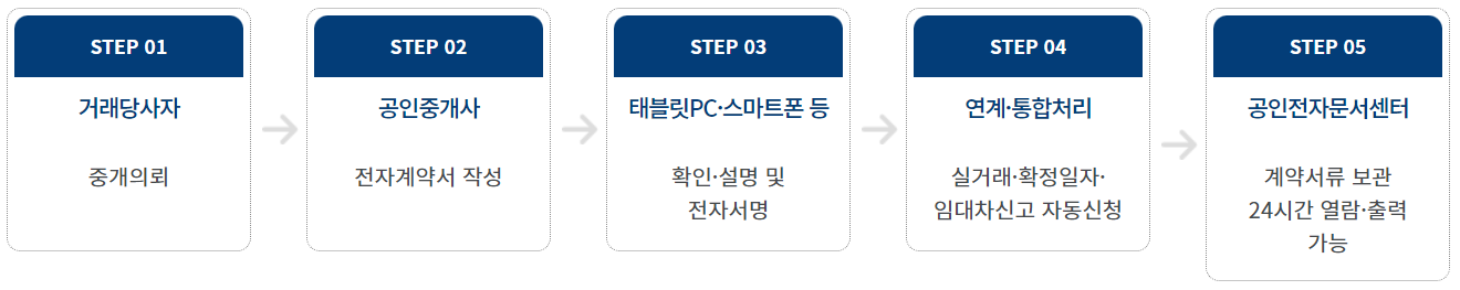 부동산 전자계약시스템은 첨단 기술을 활용하여, 공동 인증·전자서명, 부인방지 기술을 적용하여 종이·인감 없이도 온라인 서명으로 부동산 전자계약 체결, 실거래 신고 및 확정일자 부여 자동화, 거래계약서·확인 설명서 등 계약서류를 공인된 문서보관센터에 보관하는 전자적 방식(공동 인증 등)의 부동산거래 계약서 작성 및 체결 시스템입니다.